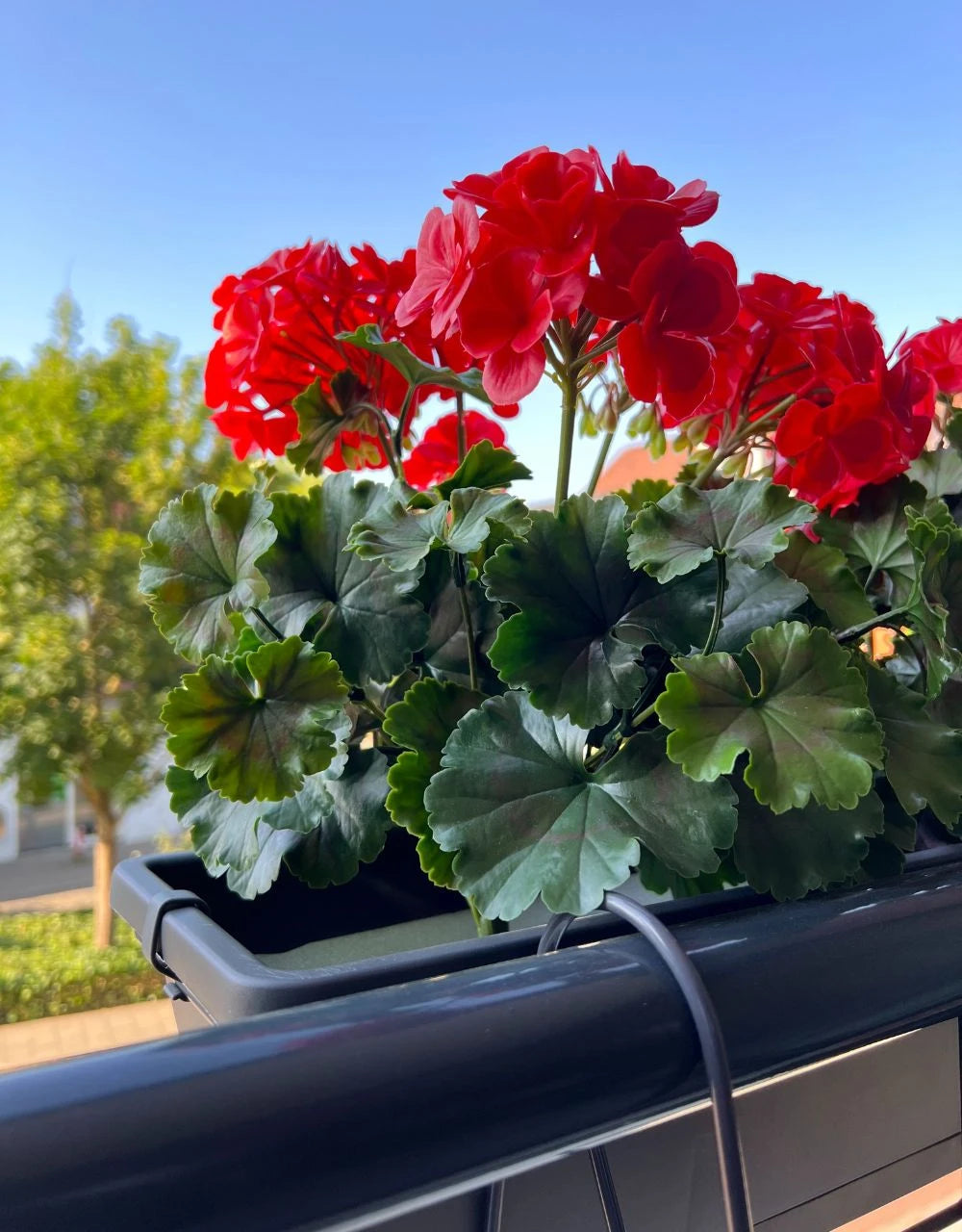 Kunst Geraniums met 8 jaar Kleurgarantie in een balkonbak, kant-en-klaar. Ophangen en klaar. Gemak voor op jouw balkon. Gegarandeerd voor jarenlang!