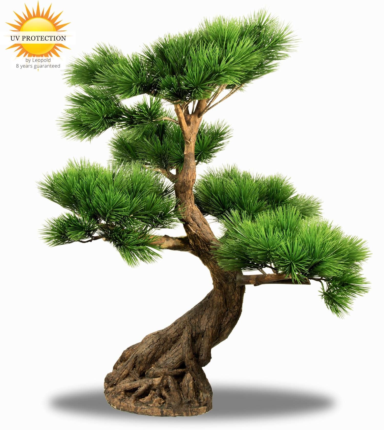De hoofdstam van deze dennenboom is van kunststof gemaakt met daarin bevestigd de houten zijtakken. De dennennaalden zijn zoals al onze Pinus kunst Bonsai bomen van de allerbeste grondstoffen gemaakt om langdurig buiten te kunnen staan.