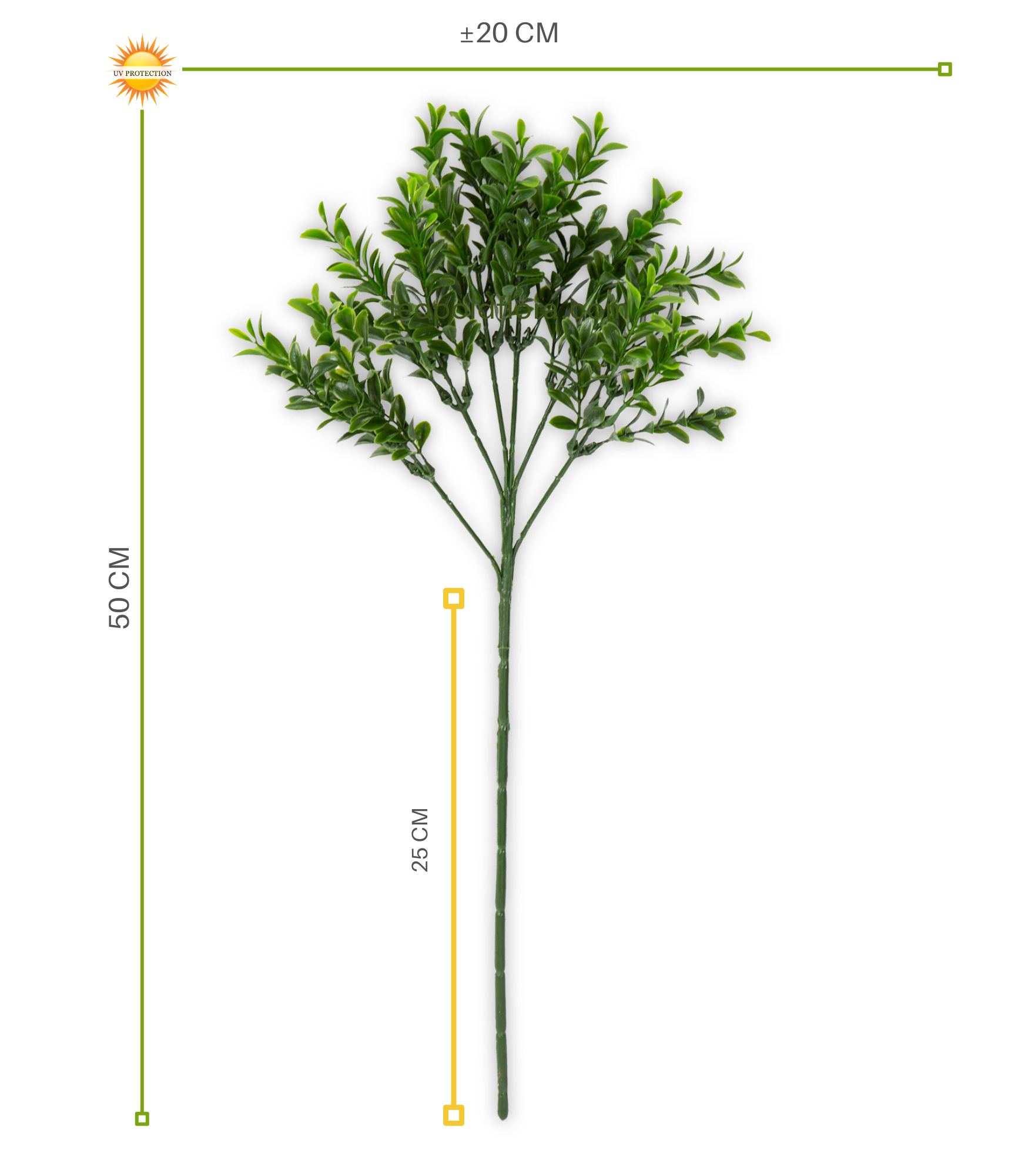 Met deze kunststof Buxus tak kunt u werkelijk alle kanten op. De ideale groene kunststof decoratie voor op de tuintafel buiten of bij de entree in hoge vazen. Er zijn altijd wel plekken in of rondom het huis waar het niet eenvoudig is om planten mooi te houden. Deze kunststof kunst buxus tak is daarop een uitzondering, is altijd mooi groen, onderhoudsvrij en is nauwelijks van echt te onderscheiden.