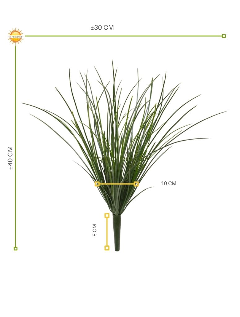 Dit fraaie kunststof grasplantje is door ons speciaal ontwikkeld voor buiten en heeft zodoende speciale ingrediënten toegevoegd gekregen gedurende het produktie proces. Hierna is er een langdurige testperiode geweest in het Laboratorium om de uv-bestendigheid te testen. Naar aanleiding van de test kunnen wij garanderen dat dit kunststof grasplantje minimaal 8 jaar bestand is tegen uv-licht.
