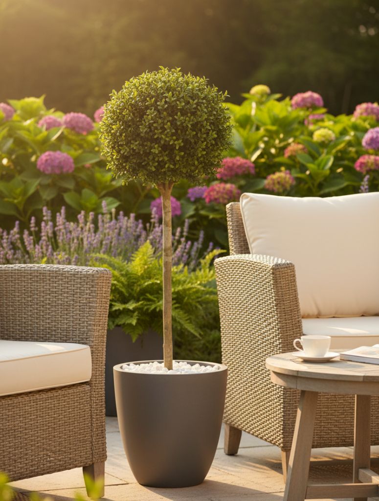 De bol op stam ziet er zeer natuurgetrouw uit, met name door de echte houten stam. Deze uvkunstplant zal zeker niet misstaan in een mooie balkonbak bij uw entree.